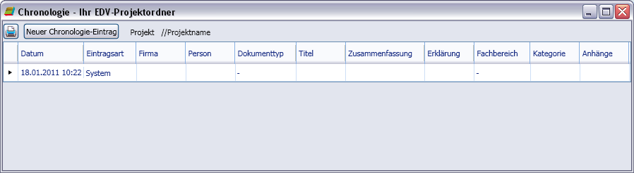 Dokumente, die Sie im BaustellenPilot auf der Basis der Vorlagen erstellen, werden beim ersten Speichern automatisch in die Chronologie eingetragen. Um einen Eintrag in der Chronologie manuell zu erstellen, gehen Sie wie folgt vor: