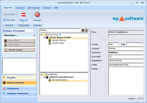 Zu jeder Firma können auch Personen angelegt werden. Auf diese Daten kann z.B. in der Maske 'Evaluierungsdaten' / Daten der Gefährdungsbeurteilung' zugegriffen werden.